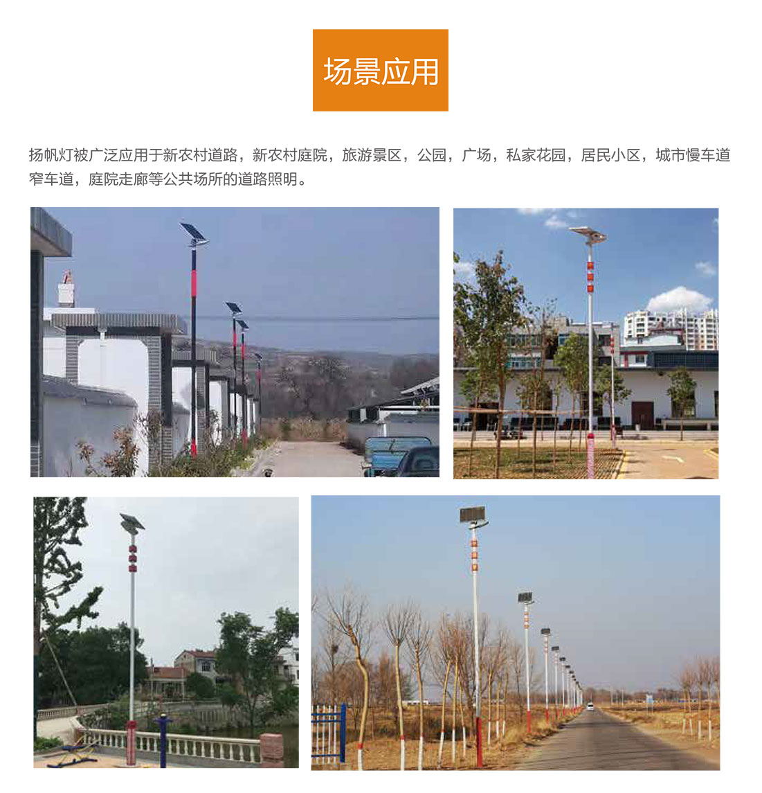 揚(yáng)帆燈作為一體化太陽能路燈,被廣泛應(yīng)用于新農(nóng)村道路、旅游景區(qū)、公園、廣場、居民小區(qū)、城市慢車道/窄車道等場景。